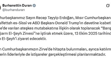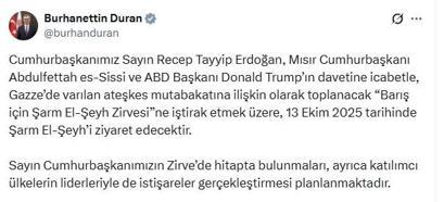 Cumhurbaşkanlığı İletişim Başkanı Burhanettin Duran, Cumhurbaşkanı Recep Tayyip Erdoğan'ın, Mısır Cumhurbaşkanı Abdulfettah es-Sisi ve ABD Başkanı Donald Trump'ın davetine icabetle, Gazze'de varılan ateşkes mutabakatına ilişkin olarak toplanacak "Barış...