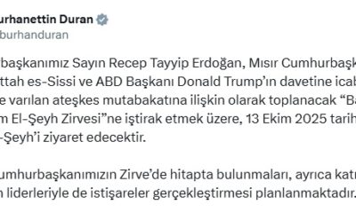 İletişim Başkanı Burhanettin Duran, yaptığı açıklamada, Cumhurbaşkanı Recep Tayyip Erdoğan’ın, Gazze’de varılan ateşkes mutabakatına ilişkin olarak toplanacak olan “Barış için Şarm El-Şeyh Zirvesi”ne katılmak üzere Mısır’a bir...