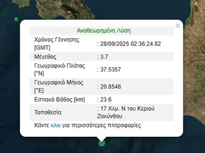Σεισμική δόνηση μεγέθους 3,4 βαθμών της Κλίμακας Ρίχτερ σημειώθηκε στις 01:47 τα ξημερώματα της Παρασκευής (26/9) στην θαλάσσια περιοχή της Ζακύνθου.