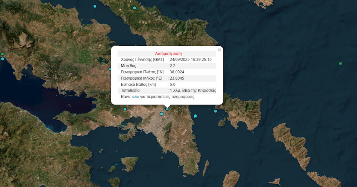 Ασθενής σεισμός 2,2 Ρίχτερ σημειώθηκε το απόγευμα της Τετάρτης (24/9) στην Αττική, σύμφωνα με το Γεωδυναμικό Ινστιτούτο.