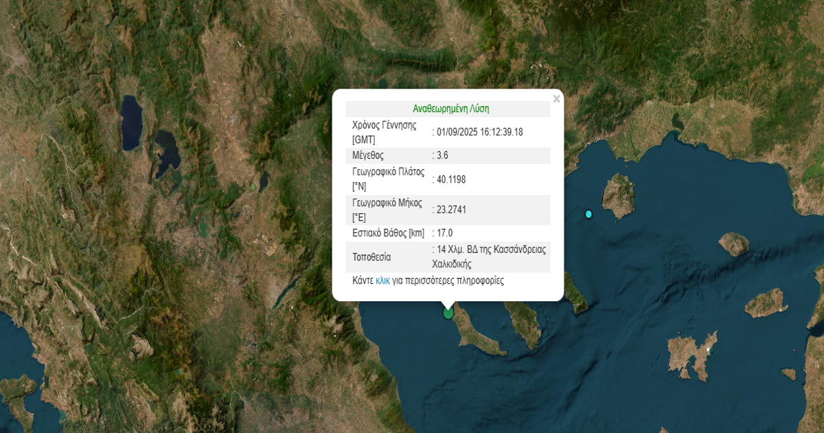Σεισμός μεγέθους 3,6 Ρίχτερ σημειώθηκε σήμερα, Δευτέρα (1/9/2025), λίγο μετά τις 19:00 στη Χαλκιδική και το επίκεντρο εντοπίστηκε στην Κασσάνδρα.