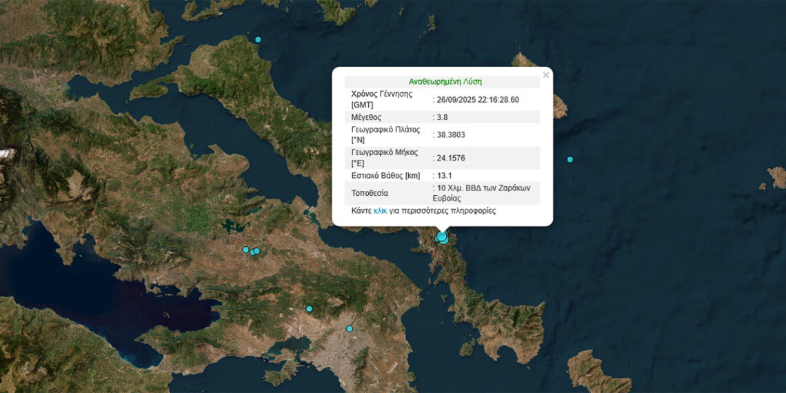 Νέος σεισμός μεγέθους 3,7 Ρίχτερ ταρακούνησε το μεσημέρι της Τετάρτης (10.09.2025) την Εύβοια.